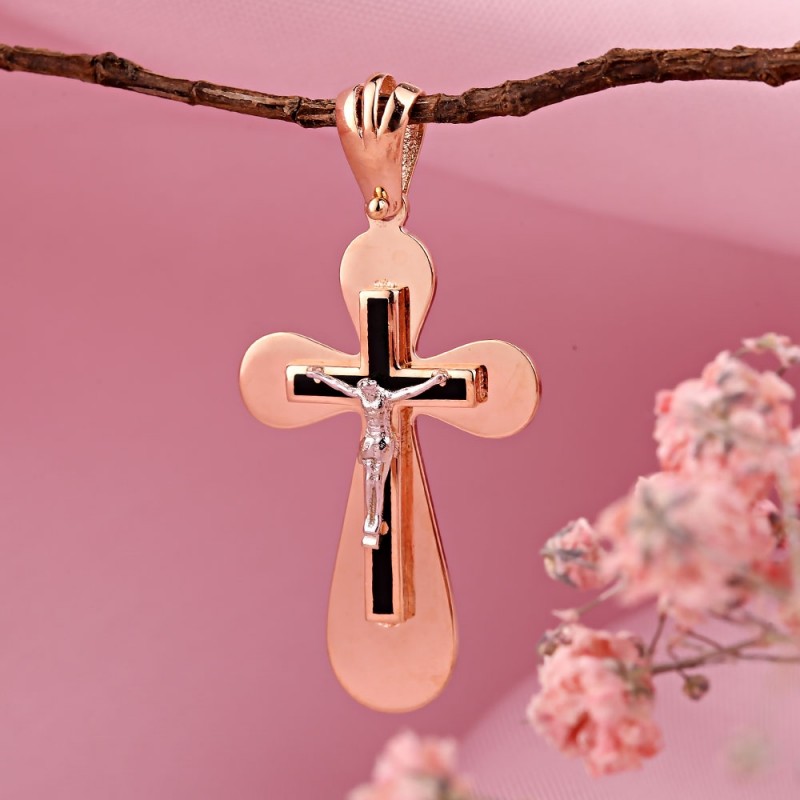 Руско злато 585 в Германия кръст висулка с разпятие от 585 бяло/червено злато. Фигурата на Христос е изработена от бяло злато на черен емайлиран фон. В горната част на кръста има халка за шнур или верижка. Не се драска при носене.