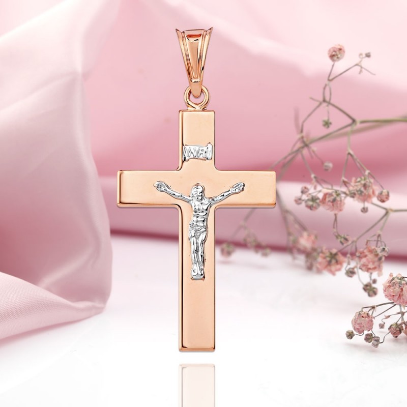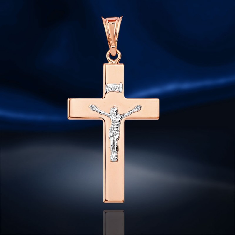 Руско злато 585 в Германия кръст висулка с разпятие от 585 бяло/червено злато. Фигурата на Христос и надписът “INRI” са изработени от бяло злато. На гърба на кръста е гравирана закрилна молитва „Спаси и запази“. В горната част на кръста има халка за шнур или верижка. Не се драска при носене.