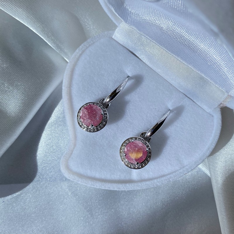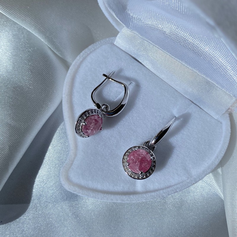 Очарователни обеци от сребро проба 925, украсени с искрящ цирконий и тъмно розов кварц.