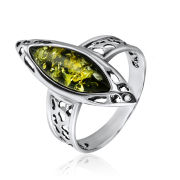 Елегантен пръстен от сребро проба 925, родиево покритие, украсен с кехлибар, с това невероятно "парче слънце", във всички нюанси на зеления цвят, ще ви зарадва и зарадва с красотата си!