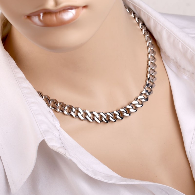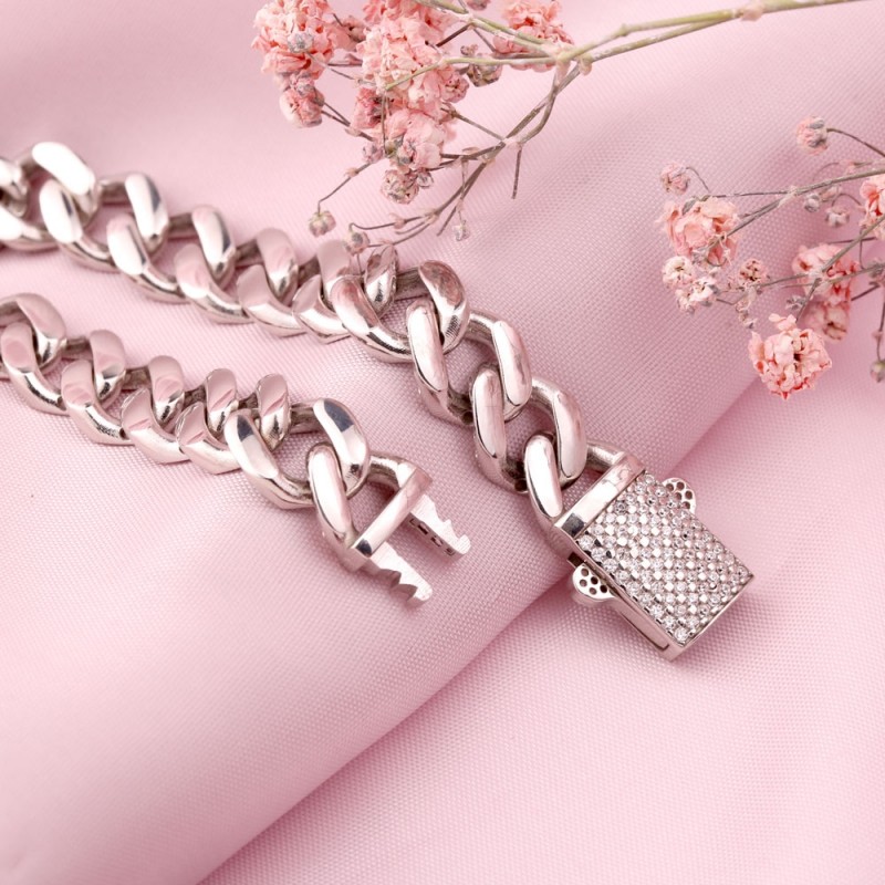 Класическа здрава верижка от сребро проба 925. Бронирана мрежа с диамантено изрязване и родиево покритие. Ключалката на веригата е украсена с искрящи цирконии. Тъкането на бордюрна верига е един от най-популярните видове огърлици днес. Този вид плетиво е разнообразен, красив и практичен. Шлифоването на връзките от двете страни им придава блясък и привлекателност. Тъкането на бордюри е издръжливо и надеждно.