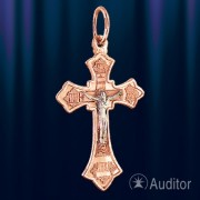 Penjoll creuat amb crucifix rus 585 a Alemanya, ortodox. La figura de Crist està feta d’or blanc 585, la creu està feta d’or vermell 585 amb un patró gravat. A la part posterior de la creu, una oració protectora "salvada i conservada" està gravada. A la part superior de la creu hi ha un anell per a un cordó o una cadena. No es ratlla quan es porta. Consagrat en kostroma.