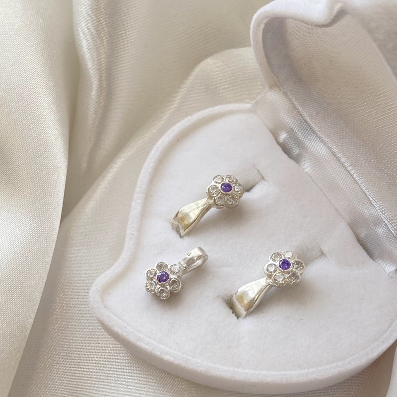 Conjunt de plata de llei 925 amb zirconi brillant i zirconi morat! Les dones fa temps que han intentat emfatitzar la seva bellesa, fragilitat i encant amb l'ajuda de joies. La joieria de dona té moltes cares. Poden reflectir tant la gràcia com la modèstia i l'extravagància de la imatge.