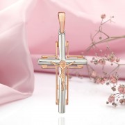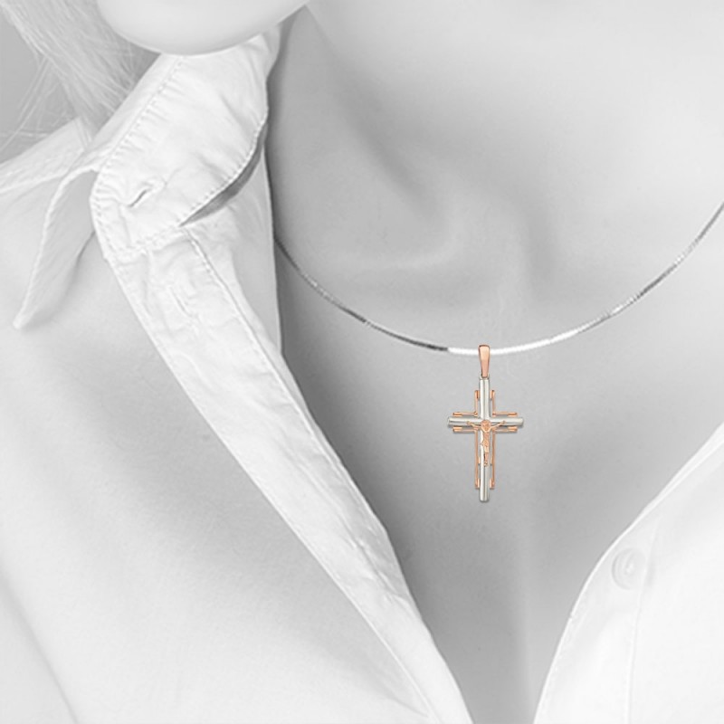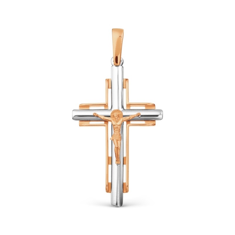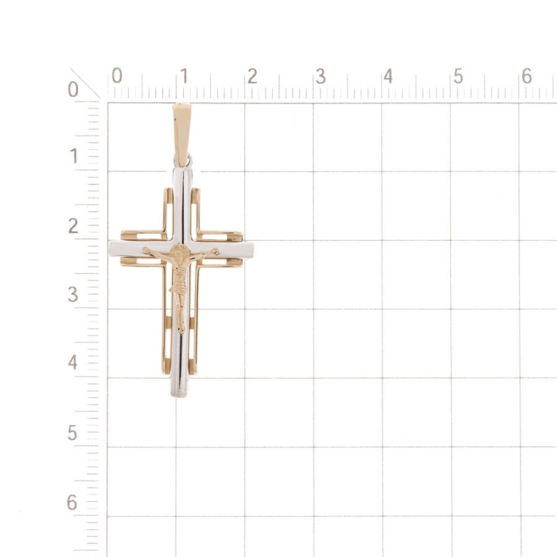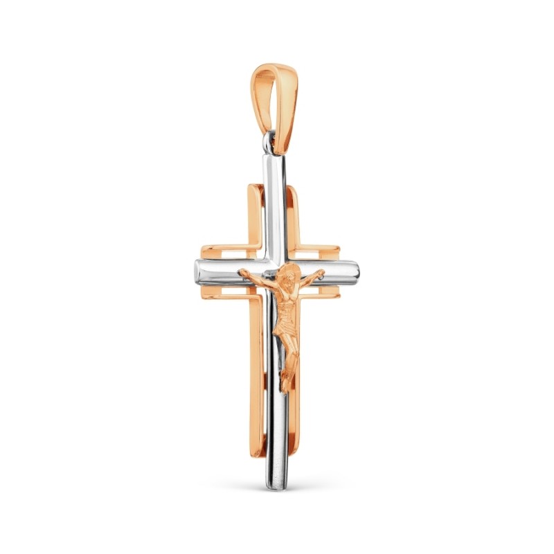Creu pectoral daurada amb crucifix d'or vermell rus i blanc 585. A la base hi ha una creu feta a part d'or blanc sobre la qual s'enganxa una figura de Crist. Al dors de la creu hi ha la inscripció "Guardar i conservar". A la part superior de la creu hi ha un anell per a cordó o cadena.