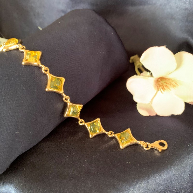 Una polsera femenina festiva feta de plata 925 banyada daurada i decorada amb ambre, amb aquesta sorprenent "peça del sol", jugant en tots els tons de color mel, encisadora i captivadora per la seva bellesa, us delectarà una vegada i una altra! Una oportunitat única per emfatitzar la teva individualitat, transmetre la imatge de feminitat i tendresa. Una bonica combinació d'or brillant i ambre assolellat dóna al teu look un ambient festiu!