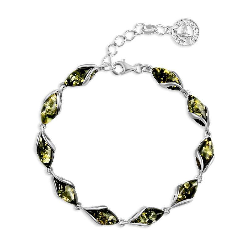 Una deliciosa polsera femenina feta de plata 925 rodiada i decorada amb ambre, amb aquesta sorprenent "peça del sol" jugant en tots els tons de verd, encantadora i captivadora per la seva bellesa, us delectarà una vegada i una altra! Una oportunitat única per emfatitzar la teva individualitat, transmetre la imatge de feminitat i tendresa. Una bonica combinació de plata brillant i ambre verd li dóna un ambient festiu al teu look!