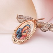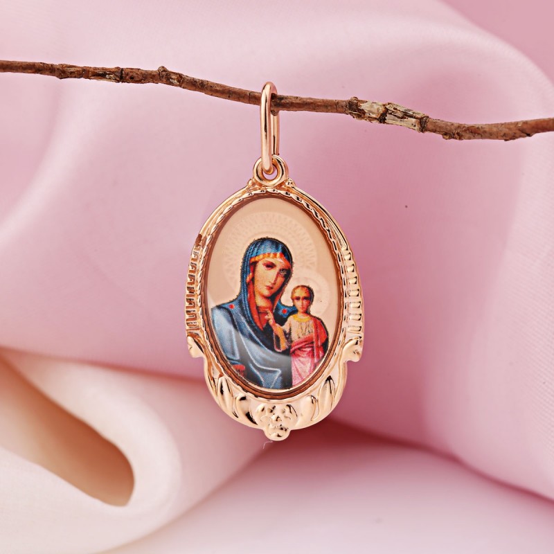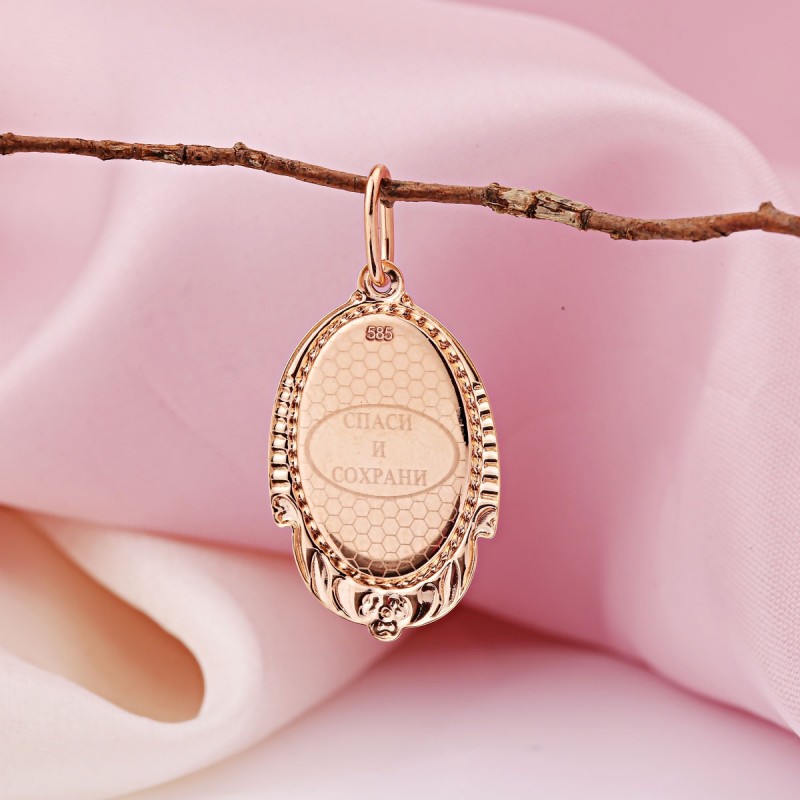 Penjoll d'icona d'or fet d'or rus vermell de 14k amb esmalt incolor. Hi ha una cadena a la part superior del penjoll.