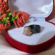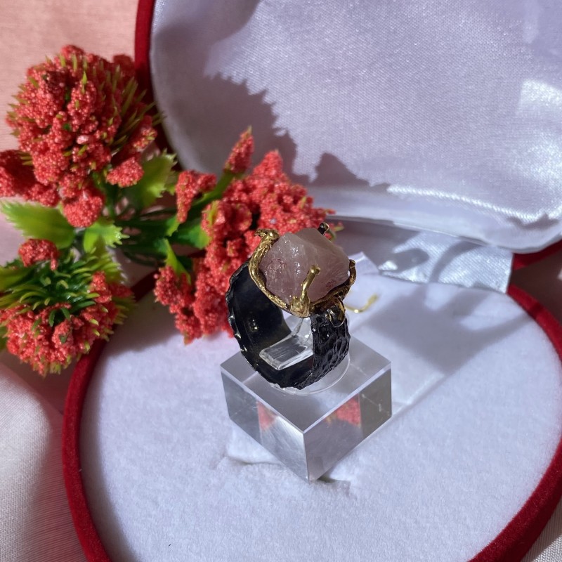 Un encantador anell fet de plata 925 ennegrida amb bany d'or groc massís, decorat amb bell quars rosa natural sense processar. Gràcies als accents hàbilment col·locats amb xapat daurat, l'anell té un aspecte excepcionalment bonic. Una excel·lent incorporació a la teva imatge de feminitat i romanç.