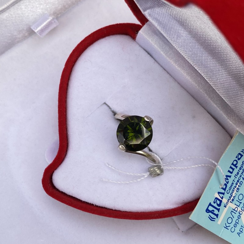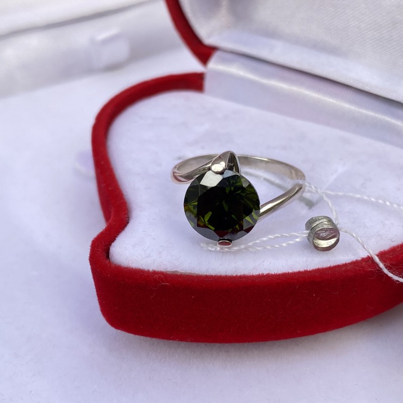 Deliciós anell delicat amb una encantadora i brillant zirconia de color oliva fosc en un bonic marc de plata ennegrida fet de plata 925. Aquesta decoració té la missió de transmetre els sentiments més brillants i alts al seu propietari! El color de la pedra conté un poder enorme i ho demostra amb esplendor aristocràtic. Sembla que embolcalla el seu propietari de calidesa, distreint-la de l'enrenou del món que l'envolta. El tall rodó emfatitza el carisma de la pedra i revela la seva versatilitat; aquestes joies poden emfatitzar el vostre gust impecable.