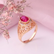 Anell d'or amb corindó robí Or rus 585. Aquest anell d'or vermell rus 585 en un marc de filigrana, decorat amb corindó robí, simbolitza la força i el poder. Un robí corindó en un anell d'or destaca que el seu propietari ha aconseguit una certa posició a la societat i també simbolitza l'amor apassionat. Un regal meravellós per a un ésser estimat!
