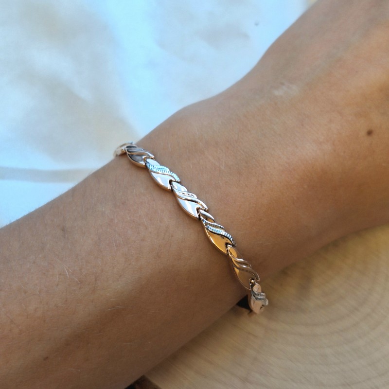 Polsera d'or rus 585°. Excel·lent polsera d'or rosa 585 clàssic amb detalls d'or blanc tallats en diamants. Una decoració meravellosa per al teu canell. Aquest producte destaca la sofisticació i un fort sentit de l'estil!