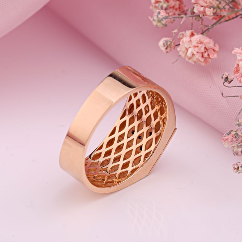 Stylový pánský prsten vyrobený ze 14karátového červeného zlata s mřížkovou základnou. Horní, vysoce leštěná platforma je zdobena ozdobnou vložkou z černé zirkony. Na vnitřní, uzavřené ploše prstenu je razítko se vzorkem zlata.