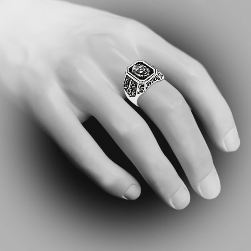 Pánský pečetní prsten z ryzosti 925 mincovního stříbra pro muže, zdobený reliéfním znakem lva a reliéfním vzorem. Stříbrný vzor vypadá obzvláště působivě na černém smaltovaném pozadí. Každý muž chce mít svůj stylový přízvuk, drahou věc, která zdůrazňuje status.