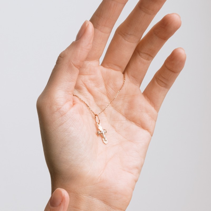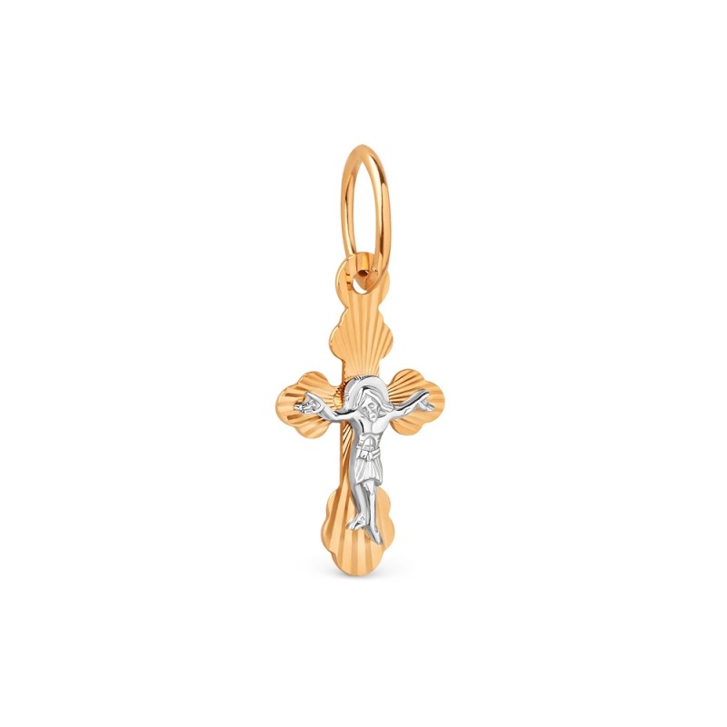 Pravoslavný kříž 585 zlatý s krucifixem. Pravoslavný kříž z červeného zlata 585 s korpusem a částečným rhodiováním. Kontrast mezi červeným zlatem a bílým rhodiem zdůrazňuje krucifix.