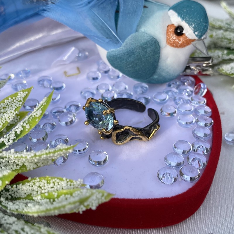 Okouzlující prsten z černěného stříbra 925 s masivním žlutým zlatem, zdobený krásným velkým topazem. Díky šikovně umístěným akcentům pomocí pozlacení vypadá prsten jedinečně krásně. Vynikající doplněk k vaší image ženskosti a romantiky.