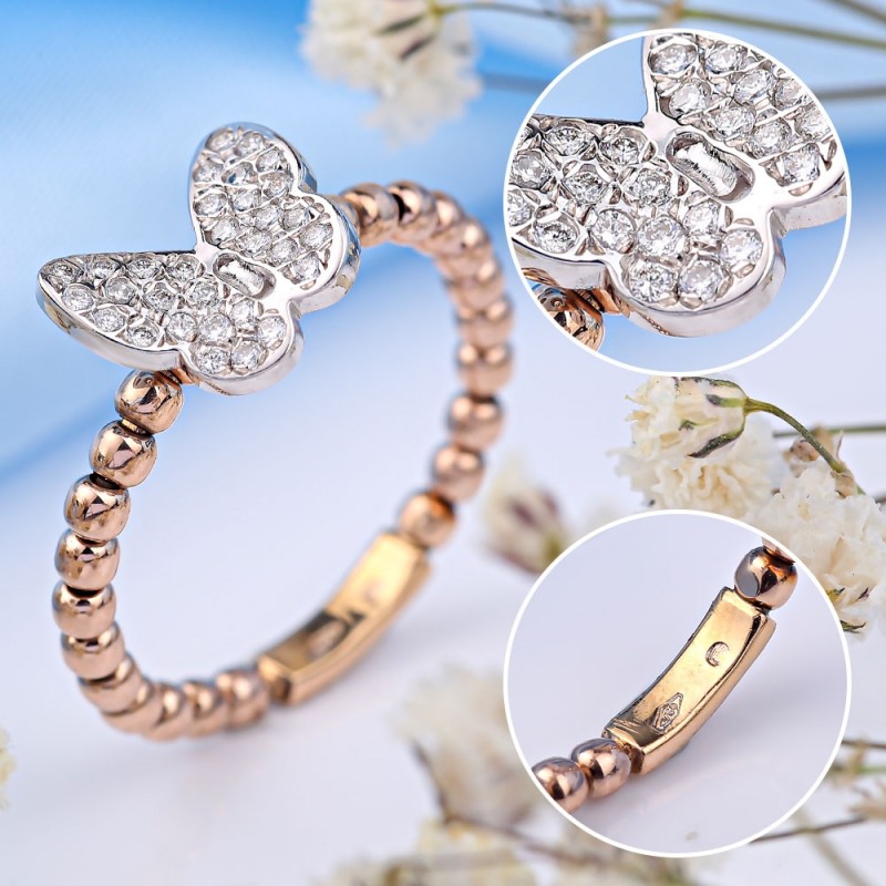 Gianni Lazzaro er et unikt mesterværk! 750 hvid/rød guld med diamanter. Kombineret guld skaber en harmonisk farvealliance og de rigtige rammer for smukke og dyre sten. Takket være sin specielle form og diamanternes smukke lysspil understreger ringen skønheden og sofistikeringen af kvindelige hænder. Ringbøjlen er dekoreret med bevægelige guldkugler. Dette understreger ringens unikke karakter og gør den nemmere at tage på.