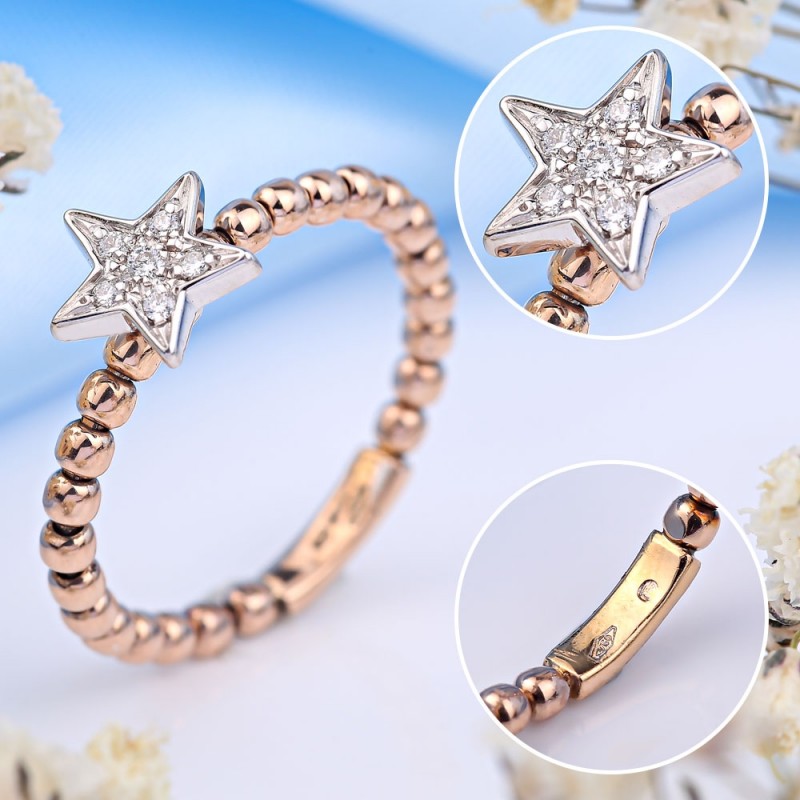 Gianni Lazzaro er et unikt mesterværk! 750 hvid/rød guld med diamanter. Kombineret guld skaber en harmonisk farvealliance og de rigtige rammer for smukke og dyre sten. Takket være sin specielle form og diamanternes smukke lysspil understreger ringen skønheden og sofistikeringen af kvindelige hænder. Ringbøjlen er dekoreret med bevægelige guldkugler. Dette understreger ringens unikke karakter og gør den nemmere at tage på.