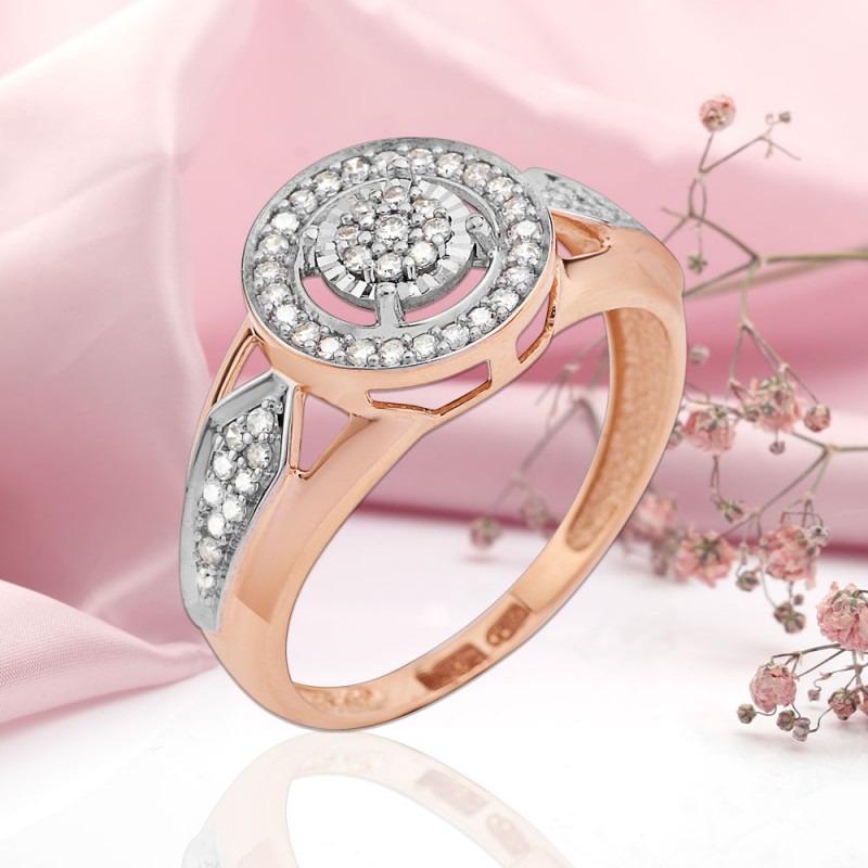 Guldring med diamanter i Tyskland. Ring lavet af 585 russisk rødguld med diamantslebne hvidguldsaccenter, der perfekt fremhæver diamanternes gnistre og unikke skønhed. En elegant guldring med diamanter til smukke damefingre! Selvfølgelig drømmer enhver kvinde om sådan en uforglemmelig og uforglemmelig gave som en guldring med en diamant.
