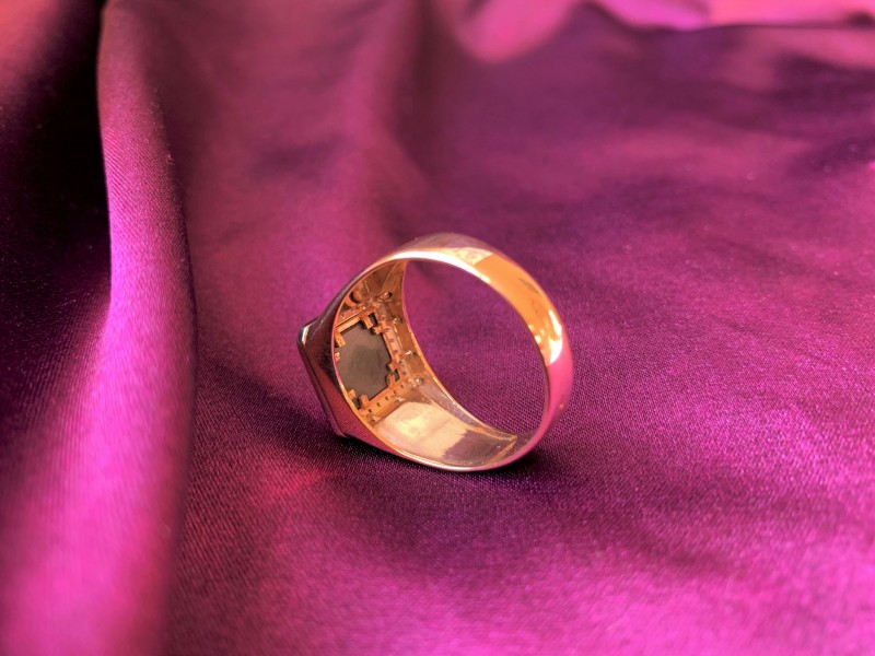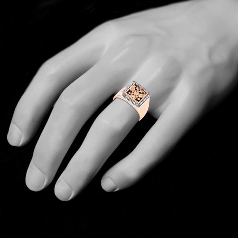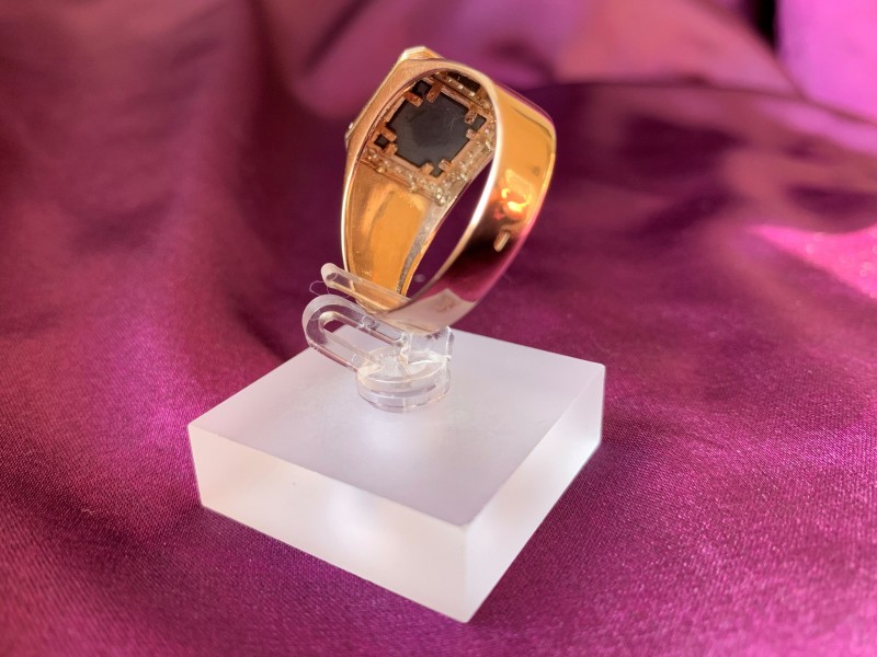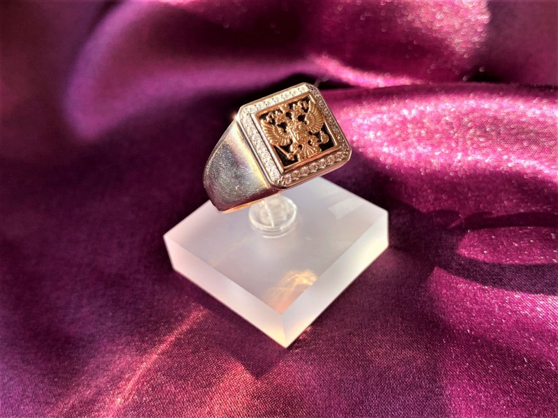Herrering - signetring, lavet af russisk rødguld 585°, dekoreret med sort cubic zirconium, dekoreret med russisk våbenskjold. På den indvendige lukkede overflade af ringen er der et stempel med guldprøven.