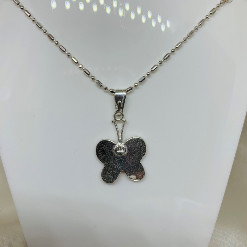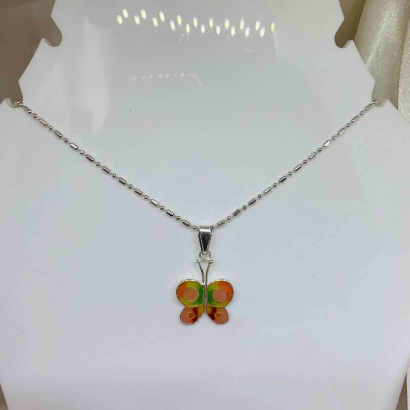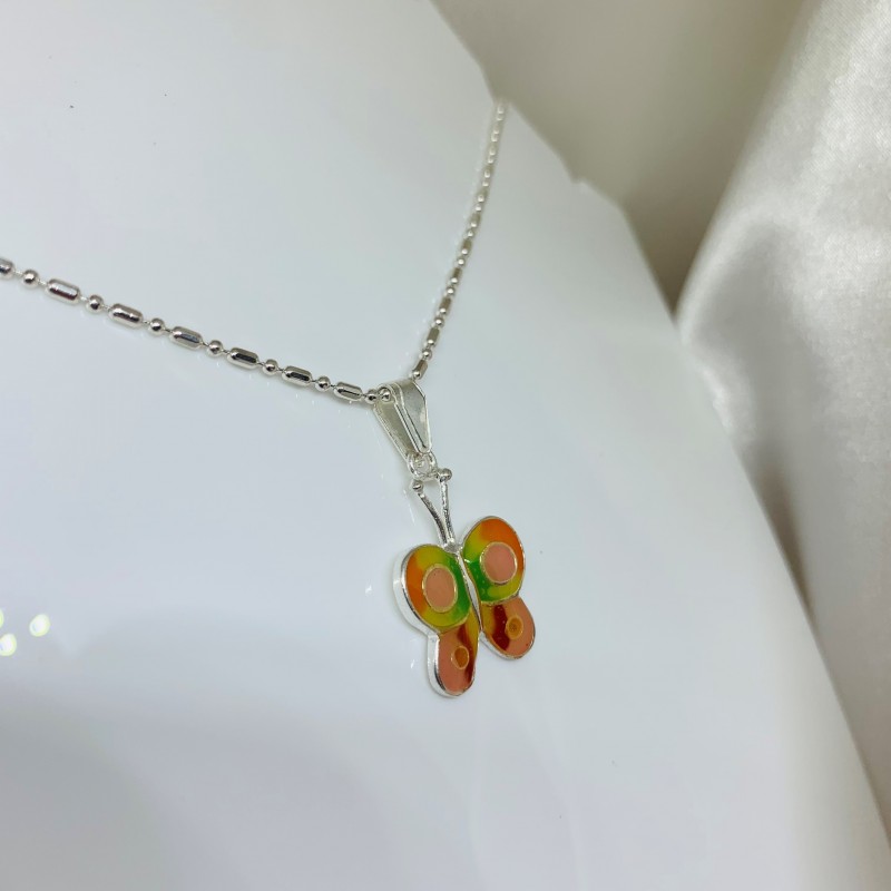 Sølvhalskæden med et "sommerfugl"-vedhæng, dækket med flerfarvet emalje, vil understrege din lille prinsesses søde, muntre natur.