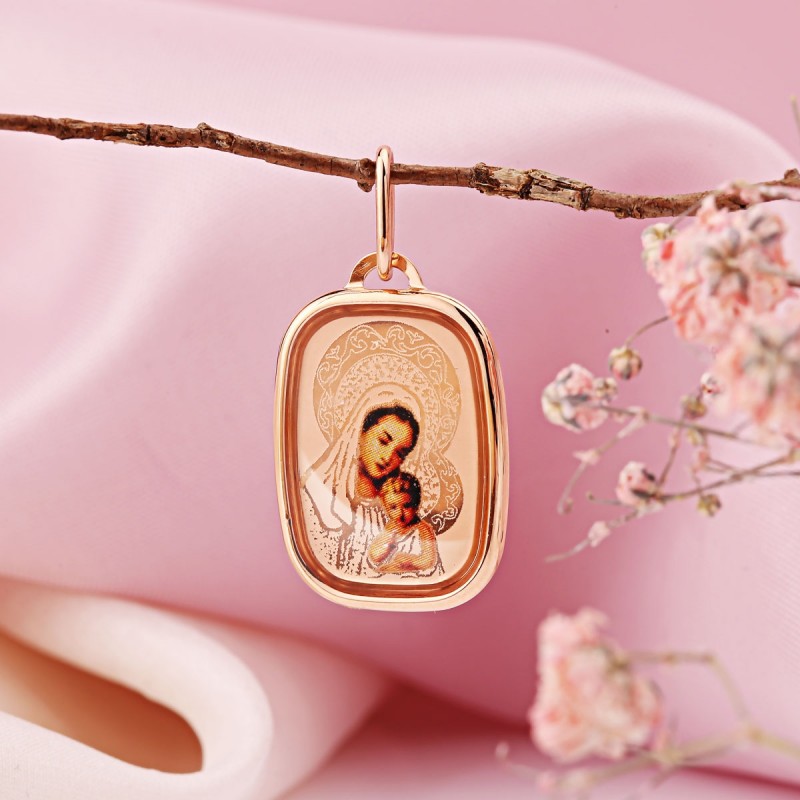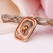 Guldikonikon vedhæng lavet af 14 karat røde russiske guld med farveløs emalje. Der er en kæde ring øverst på traileren.