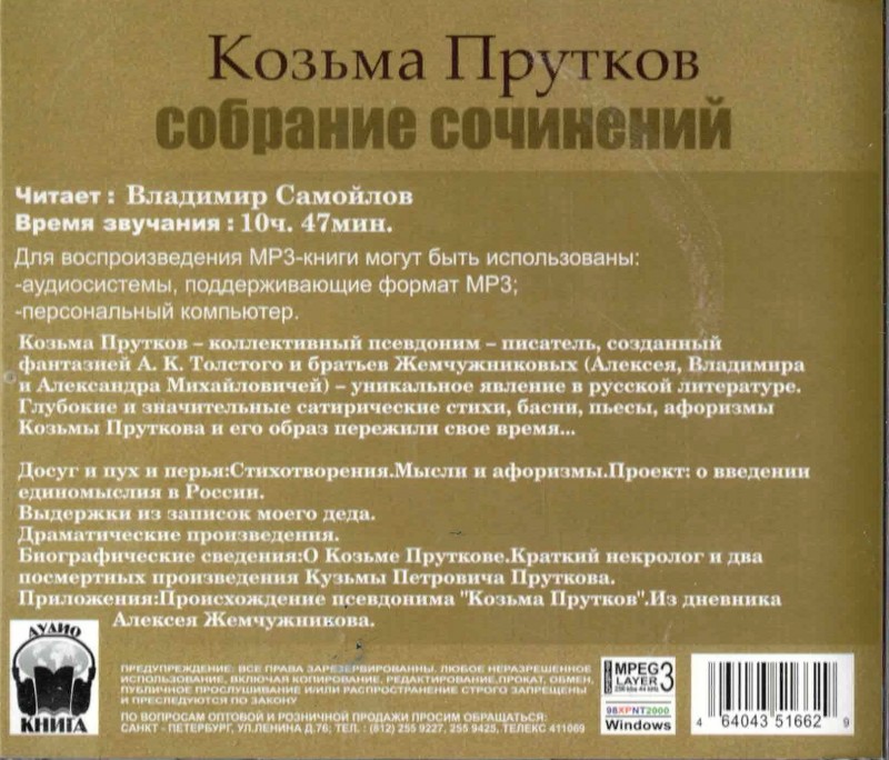 Глубокие, значительные сатирические пьесы, стихи, басни, афоризмы Козьмы Прутко Den samme person har ændret tiden og populariteten af ​​dette medie тател.
