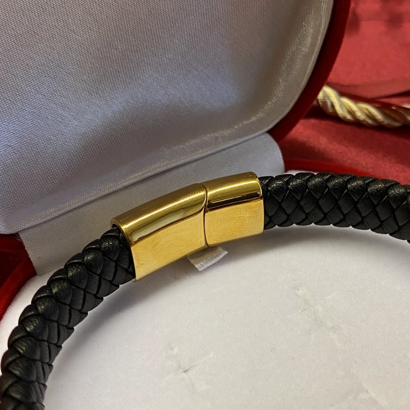 Stilfuldt læderarmbånd. Låsen og den dekorative del af armbåndet er lavet af rustfrit stål med en slidstærk belægning. Smykker lavet af 316L smykkestål ruster ikke, oxiderer ikke og er absolut sundhedsskadelige! Armbåndet ser stilfuldt og interessant ud! Kombinationen af sort læder og gylden farve giver produktet en særlig charme.