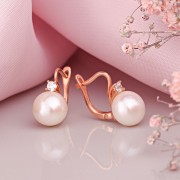 Øreringe lavet af rødguld 585 perle zirconia. Charmerende guldøreringe lavet af 585 rødt russisk guld, dekoreret med naturlige hvide kulturperler og funklende zirkoner! Disse øreringe udstråler smarte og uimodståelige! Smykker lavet af perler understreger ejernes høje sociale status og skiller sig ud fra andre smykker.