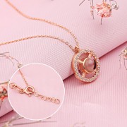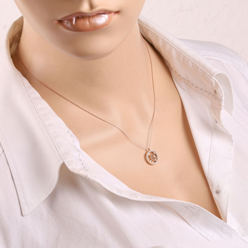 I midten af vedhænget ligger en glat, mystisk projektionssten, hvis bløde glans umiddelbart fascinerer. Den er indrammet af en udsøgt, delikat ring lavet af glitrende zirconia, der danser som små stjerner rundt i et skjult univers og giver smykket et luksuriøst, funklende udtryk.