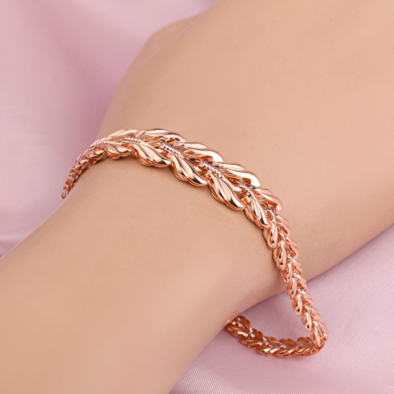 Et armbånd lavet af 585 rødguld med hvidguldsaccenter. Et elegant og feminint armbånd lavet af 585 rød- og hvidguld vil vidunderligt dekorere hænderne på yndefulde kvinder! Hver stilfuld kvinde og pige drømmer om sådanne smykker. Armbåndet ser elegant ud og tiltrækker beundrende blikke fra andre. Fantasifuld vævning!
