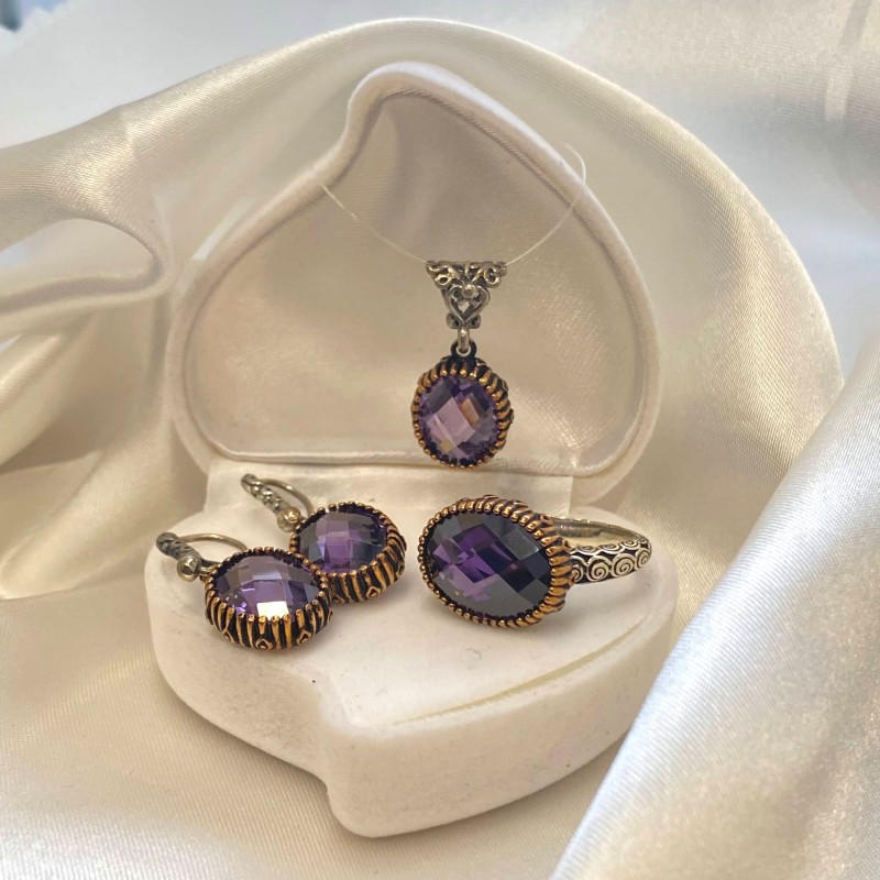 Ametyst er violet kvarts i forskellige nuancer og farvemætning. Ametystens skønhed inspirerer til beundring og nysgerrighed. Dette mineral tiltrækker alle smykkeelskere med sin farve. Fine ametystsmykker skal bæres for at nyde dens skønhed og tillade andre at nyde den. Øreringe, ringe eller andre smykker med ametyst ser anstændigt ud med de mest udsøgte outfits. Ametyst ser godt ud i kombination med kolde farver, så ametyst ser særligt fordelagtigt ud på baggrund af tøj i sådanne toner.