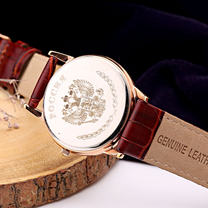 Mænds armbåndsur "Rusland" - et stilfuldt tilbehør med den russiske føderations frakke. Klassisk design med guldbelagt bolig, sølvskive og dato display. En elegant gave til elskere af tradition og symbolsk magt.