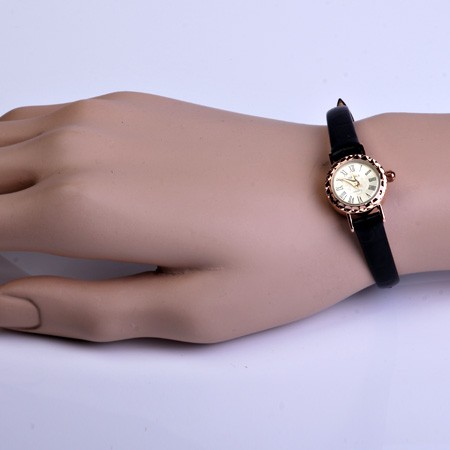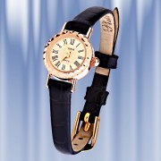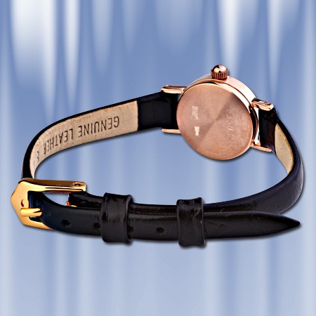 Elegant dameur lavet af 585 guld Urskive diameter 18 mm. Armbånd (længde 22 cm): Ægte læder. Bevægelse: Japan, "Citizen Co. Ltd" Garanti: 12 måneder. Type: Kvarts Støv- og stænktæt. Undgå direkte kontakt med vand.