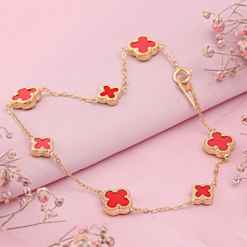 Guld armbånd gul guld koral. Dette elegante armbånd kombinerer den varme glød fra 585 gult guld med den levende energi fra naturlige koraller. De sarte firbladede elementer ligner små lykkeamuler, mens den fine ankerkæde med diamantbeklædning skaber funklende lysrefleksioner ved hver bevægelse.