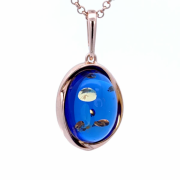 Gilded Silver Trailer med Amber Chameleon. En charmerende trailer lavet af rød -gold -Gloss 925 sølv og unik rav, med dette fantastiske "solstykke". Oprettet af en speciel teknologi, hvor et blåt underlag tilsættes til undersiden af citron rav. På grund af ravens lyspermeabilitet skabes en sådan speciel kamæleonfarve.