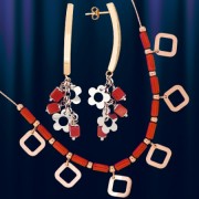 Set aus 585 Karat russischem Rotgold mit Korallen. Das Set besteht aus der Halskette KO787878 und den Ohrringen OR810050.