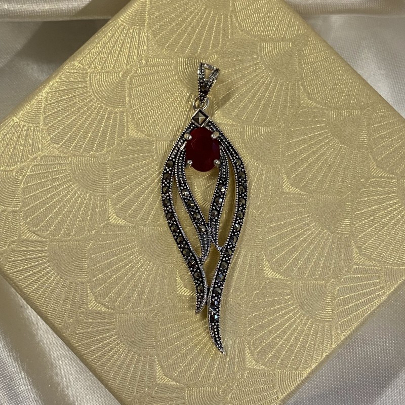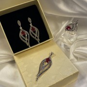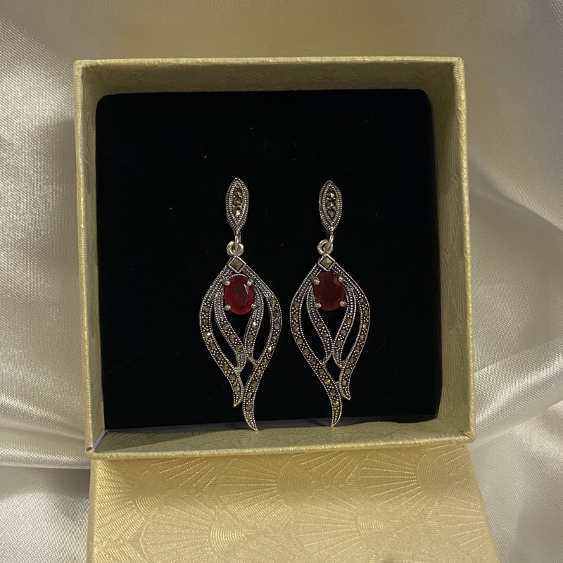 Ein entzückendes Set im osmanischen Stil aus geschwärztem 925er Sterlingsilber mit Einsätzen aus tiefem Markasit und luxuriösem Rubin! Die Kombination dieser bezaubernden Steine unterschiedlicher Größe verleiht dem Produkt ein einzigartiges Aussehen und fesselt das Auge. Ein solches Set wird die Zärtlichkeit, Weiblichkeit und den Charme seiner Besitzerin unterstreichen!