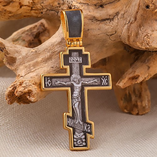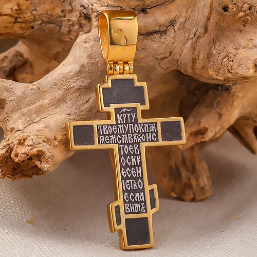 Die Vorderseite des Kreuzes zeigt die Kreuzigung des Herrn Jesus Christus. Auf der Rückseite steht ein Troparion zum lebensspendenden Kreuz: „Wir beten Dein Kreuz an, o Meister, und verherrlichen Deine heilige Auferstehung.“