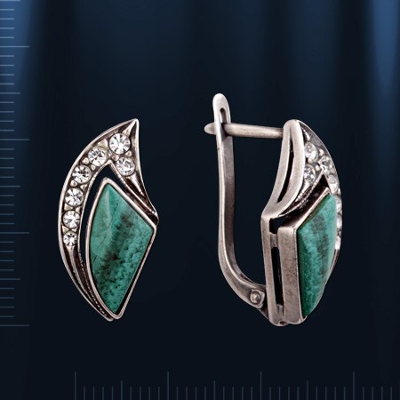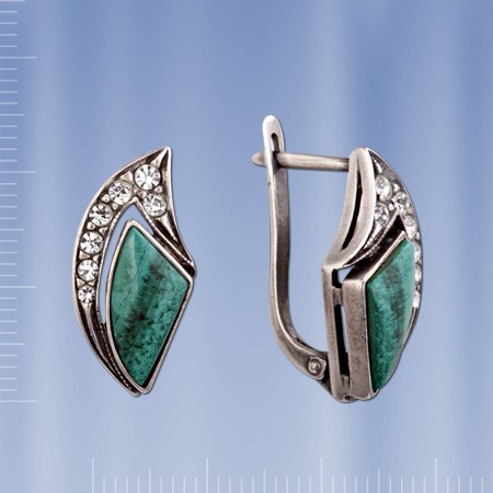 Ohrringe mit Malachit-Einsatz (14 x 7 mm), Zirkonium ¢ 1 mm. Die Beschichtung besteht aus geschwärztem Silber. Elegant und süß!