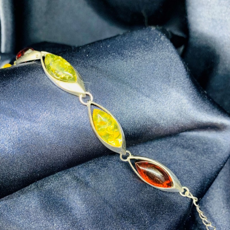 Ein exquisites feminines Armband aus 925er Sterlingsilber mit Bernstein und diesem erstaunlichen „Stück Sonne“, das mit allen Grün-, Honig- und Rottönen spielt und durch seine Schönheit bezaubert und fesselt, wird Sie immer begeistern! Eine einzigartige Gelegenheit, Ihre Individualität zu betonen und Ihrem Image Weiblichkeit und Zärtlichkeit zu verleihen. Eine wunderschöne Kombination aus funkelndem Silber und sonnigem Bernstein verleiht Ihrem Look eine festliche Stimmung!