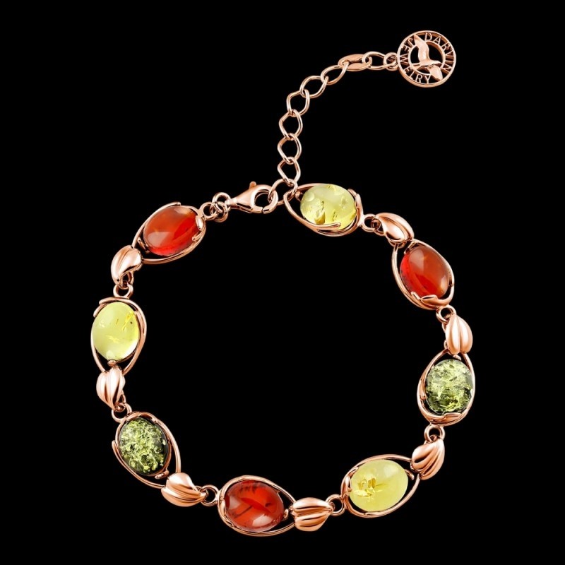 Ein elegantes, feminines Armband aus vergoldetem 925er-Silber mit Bernstein und diesem erstaunlichen „Stück Sonne“, das mit allen Grün-, Honig- und Rottönen spielt und durch seine Schönheit bezaubert und fesselt, wird Sie immer begeistern! Eine einzigartige Gelegenheit, Ihre Individualität zu betonen und Ihrem Image Weiblichkeit und Zärtlichkeit zu verleihen. Eine wunderschöne Kombination aus funkelndem Gold und sonnigem Bernstein verleiht Ihrem Look eine festliche Stimmung!