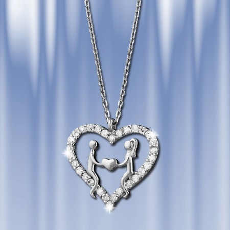 Der Anhänger „Lovers“ hat die Form eines Herzens mit dem Bild eines verliebten Paares. Einsatz: Zirkon. Anhängerhöhe 15 mm, Breite 17 mm. Kettenlänge 42 cm. 925er Sterlingsilber.