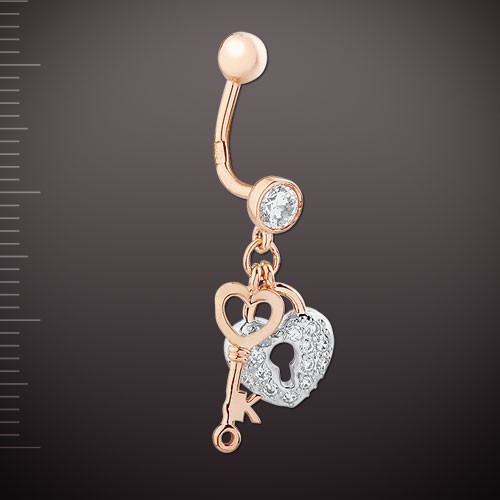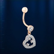 Ein goldenes Piercing mit herzförmigem Anhänger und Kugelwirbel schmückt einen wunderschönen gebräunten Bauch! Rotes russisches Gold 585°