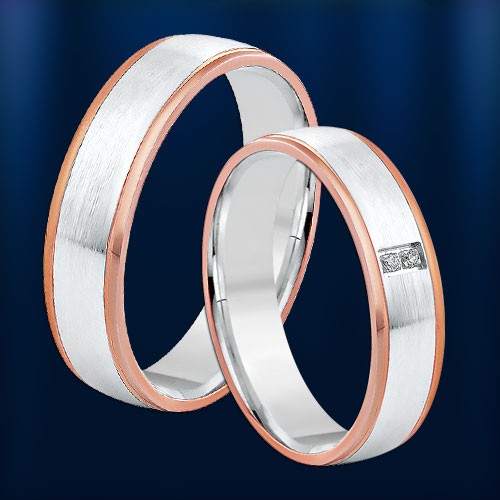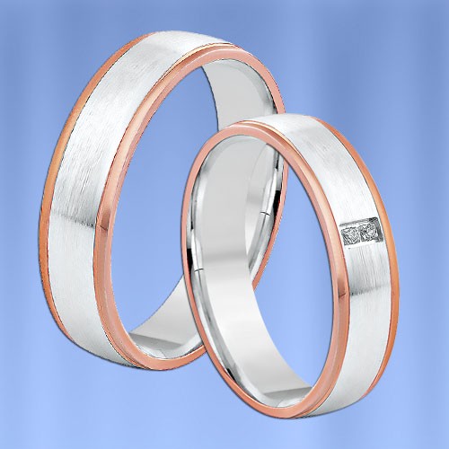 Origineller, modischer zweifarbiger Ehering aus Rot- und Weißgold 585 (matte und glänzende Textur) mit Diamanten (2 x 0,005 Karat)