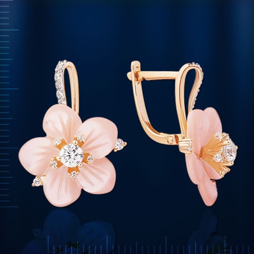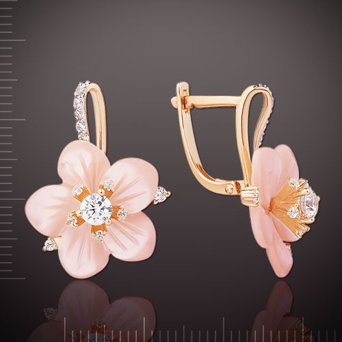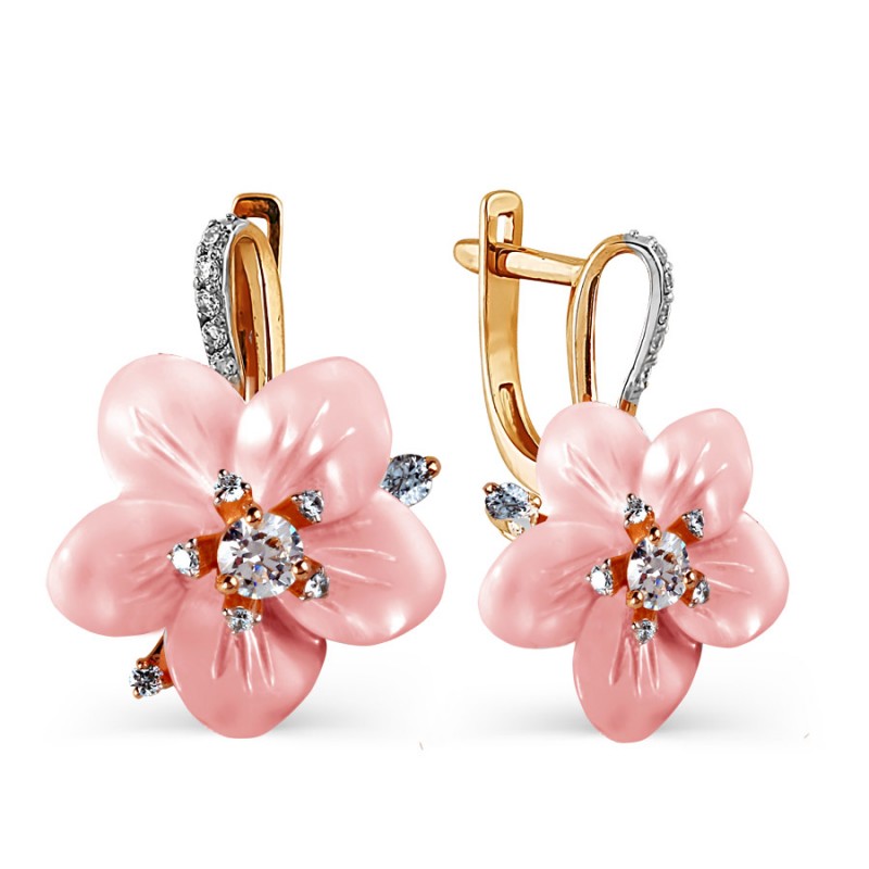 Bezaubernde zarte „Kamille“-Ohrringe aus 585 Karat russischem Rot- und Weißgold. Dieser Schmuck erfüllt höchste Ansprüche, tadellose Verarbeitung, Regenbogenschimmer aus Perlmutt, Spiel mit Zirkonia, modische Form!