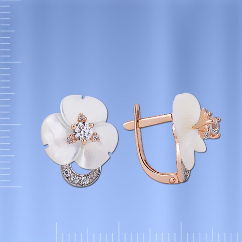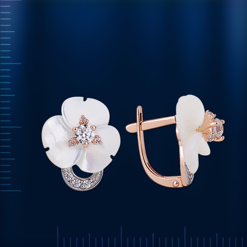 Bezaubernde zarte „Trefoil“-Ohrringe aus 585 Karat russischem Rot- und Weißgold. Diese Dekoration erfüllt höchste Ansprüche, tadellose Handwerkskunst, irisierender Perlmutt-Schimmer, Zirkonia-Spiel, modische Form!