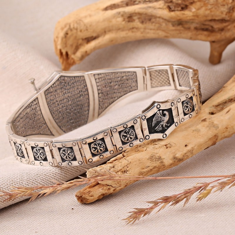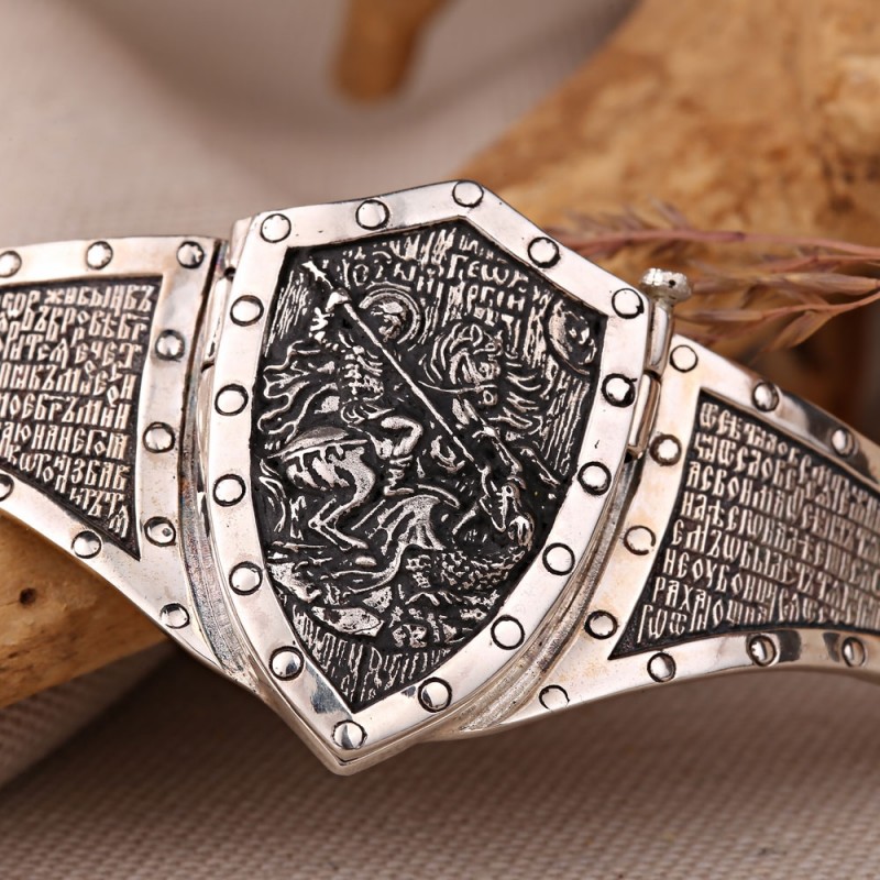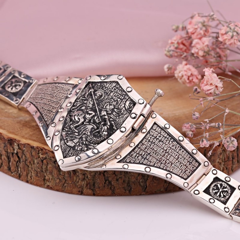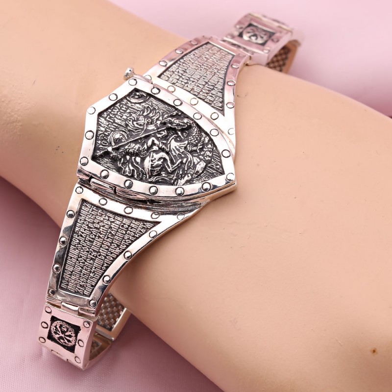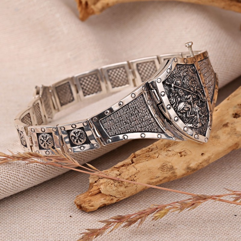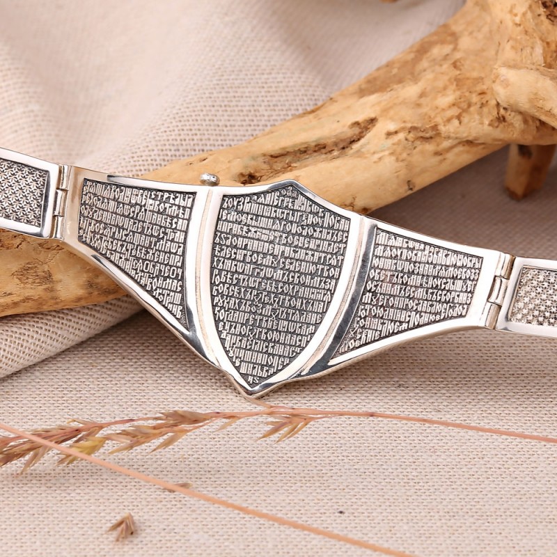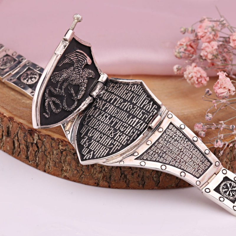Massives Armband aus geschwärztem Silber 925º, quadratische Glieder verziert mit einem Reliefmuster auf geschwärztem Hintergrund. Das Hauptglied in Form eines Schildes wird mit einer Schraube befestigt, die herausgeschraubt wird. Nach dem Abschrauben kann das Schild geöffnet werden. Auf der linken Seite des Schildes befindet sich ein Reliefbild eines Adlers, der eine Riesenschlange tötet, auf der rechten Seite ein Gebet.