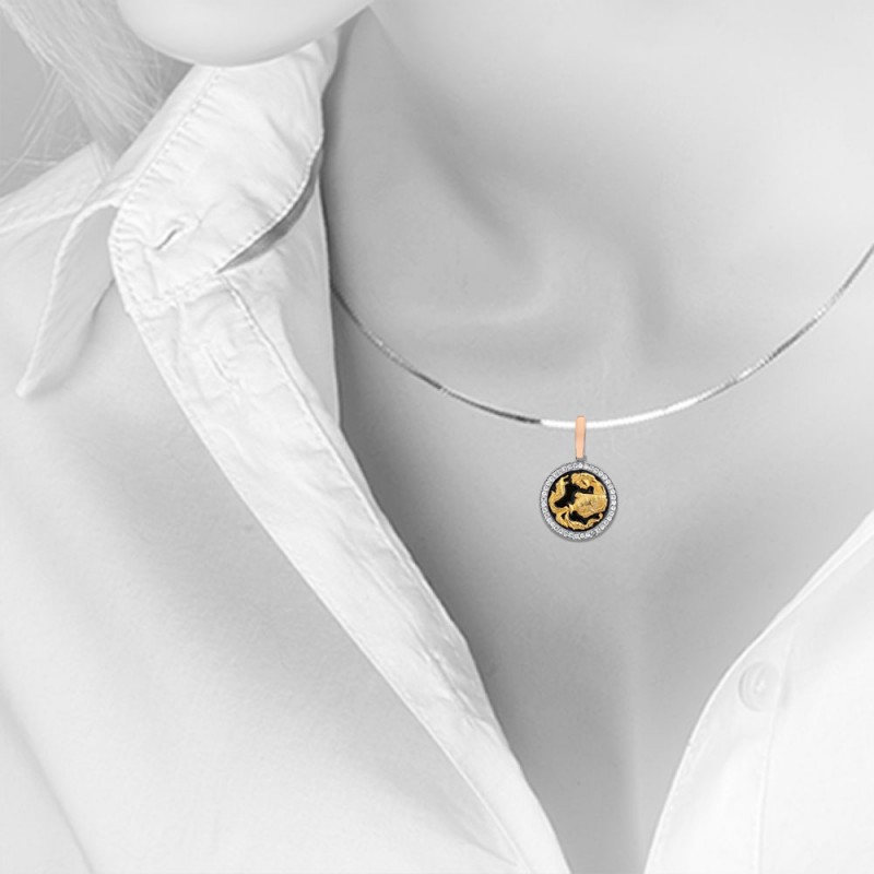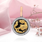 Runder Anhänger aus 925er Sterlingsilber, vergoldet. Oben am Anhänger befindet sich ein Ring für eine Kette. Vor einem schwarzen Emaille-Hintergrund wirkt das vergoldete Design besonders ausdrucksstark. Zirkonia-Einsätze unterstreichen perfekt die Wirksamkeit des Produkts. Rhodiniert!