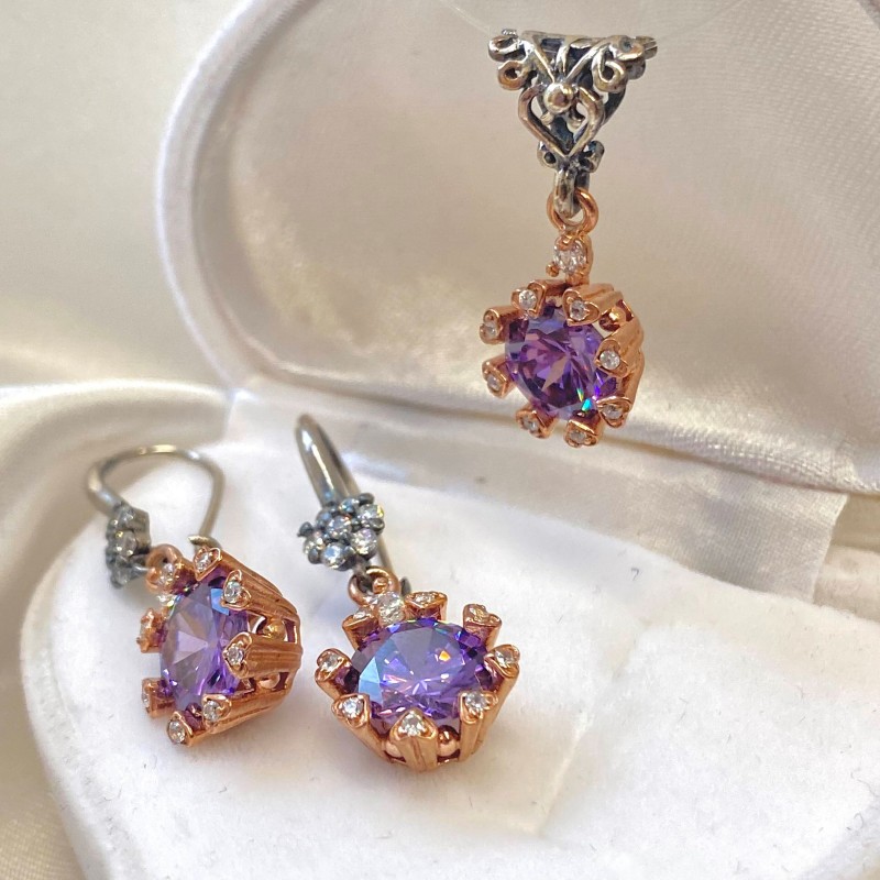 Handgefertigtes Set aus geschwärztem 925er Sterlingsilber mit einem einzigartigen Amethyst in einer bronzebeschichteten Fassung und Zirkonia-Einsätzen! Die Schleife des Rings ist mit einem filigranen Reliefmuster verziert, das den antiken Stil des Produkts unterstreicht.