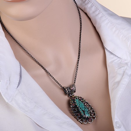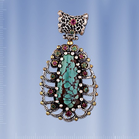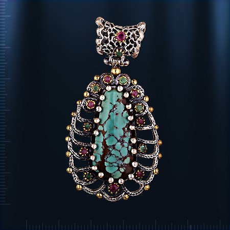 Ein stilvoller und luxuriöser handgefertigter Schmuckanhänger mit einem großen Einsatz aus iranischem grünem Türkis (30 x 14 mm), der wunderschön von 8 Rubinen (Durchmesser 2 und 3 mm) und 7 Smaragden (Durchmesser 2 mm) eingerahmt wird. Geschwärztes Silber 925, Bronze. Anhängerhöhe mit Öse 60 mm, Breite 32 mm.